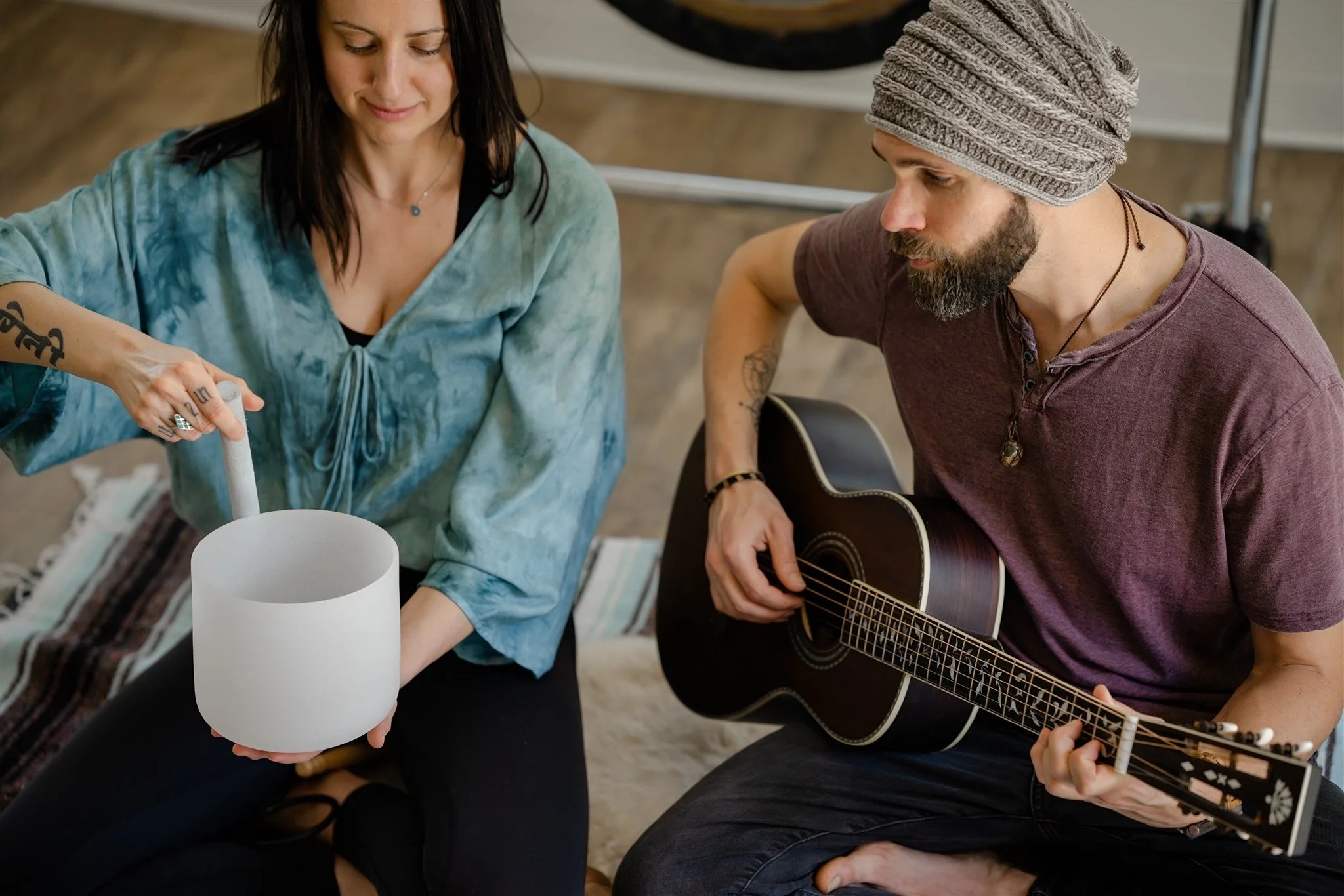 Nic and Christina bring a unique blend of experience and passion to their sound baths. Nic, a dedicated yoga teacher and sound facilitator, weaves together Kundalini Yoga, meditation, and indigenous instruments like the gong, flute, and drums to create immersive experiences. His classes encourage curiosity and self-exploration, guiding students to their physical, emotional, and spiritual edges.Christina, a seasoned yoga teacher & sound facilitator with 13 years of experience, guides vinyasa and meditation classes and trains future instructors at Hollywood Market Yoga in Boise. For the past two years, she has been incorporating the soothing tones of crystal bowls into her classes, deepening the meditative experience. Together, Christina and Nic have crafted sound bath experiences that offer a serene space for relaxation, self-discovery, and healing through sound.